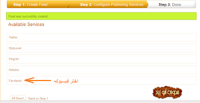 ثم بعدها قم بالضغط على كلمة" create Service" أسفل الصفحة لتفعيل الخدمة, وعندها سوف تظهر لك صفحة تبين لك الخدمات التي تم تفعيلها (Tiwitter + Facebook) ،بعدها اضغط على كلمة "All Done" اسفل الصفحة للانتهاء